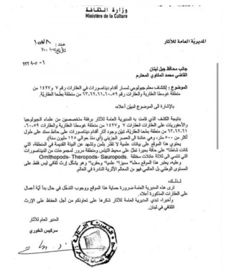 وجهت المديرية العامة للآثار في وزارة الثقافة كتاباً إلى محافظ جبل لبنان محمد مكاوي لفتت فيه إلى اكتشاف معلم جيولوجي لمسار أقدام ديناصورات في عقارات في منطقة غوسطا العقارية.