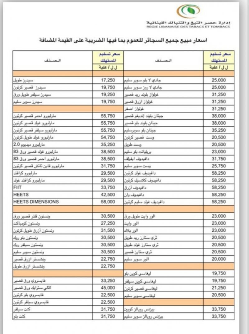"الريجي تنشر لائحة اسعار السجائر والمعسل نشرت إدارة حصر التبغ والتنباك اللبنانية “الريجي”، اللائحة الجديدة لأسعار مبيع أنواع السجائر والمعسل في لبنان، متضمنة الضريبة على القيمة المضافة. وجاءت الأسعار الجديدة على الشكل التالي: