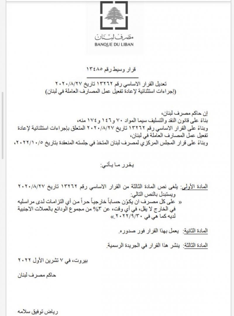 أصدر مصرف لبنان تعميماً يلزم كل مصرف بأن يكون لديه حساباً خارجيًّا حرًّا من أي التزامات لدى مراسليه في الخارج على ألا يقل عن 3 في المئة من مجموع الودائع بالعملات الأجنبية لديه. وتجدون التعميم مرفقاً.