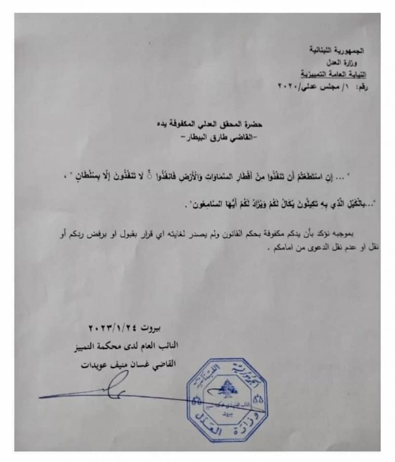 افادت مندوبة “الوكالة الوطنية للاعلام” بان النائب العام التمييزي القاضي غسان عويدات رد على القرارات التي اتخذها بالأمس المحقق العدلي في جريمة انفجار المرفأ القاضي طارق البيطار برفض هذه القرارات جملة وتفصيلاً كون البيطار مكفوفة يده عن الملف، وقد ورد في الكتاب ما حرفيته “بموجبه نؤكد بأن يدكم مكفوفة بحكم القانون ولم يصدر لغايته أي قرار بقبول أو رفض ردكم أو نقل أو عدم نقل الدعوى من أمامكم”، علماً بأن القاضي عويدات استهل كتابه بالآية القرآنية الكريمة