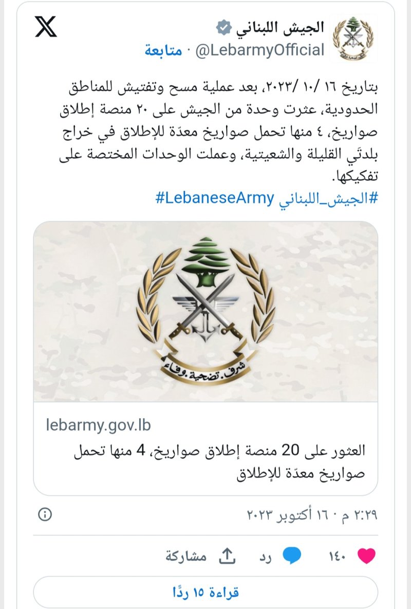 "بتاريخ 16 /١٠ /2023، بعد عملية مسح وتفتيش للمناطق الحدودية، عثرت وحدة من الجيش على 20 منصة إطلاق صواريخ، 4 منها تحمل صواريخ معدّة للإطلاق في خراج بلدتَي القليلة والشعيتية، وعملت الوحدات المختصة على تفكيكها.